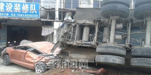 207国道上水泥车翻压小轿车 轿车严重损毁